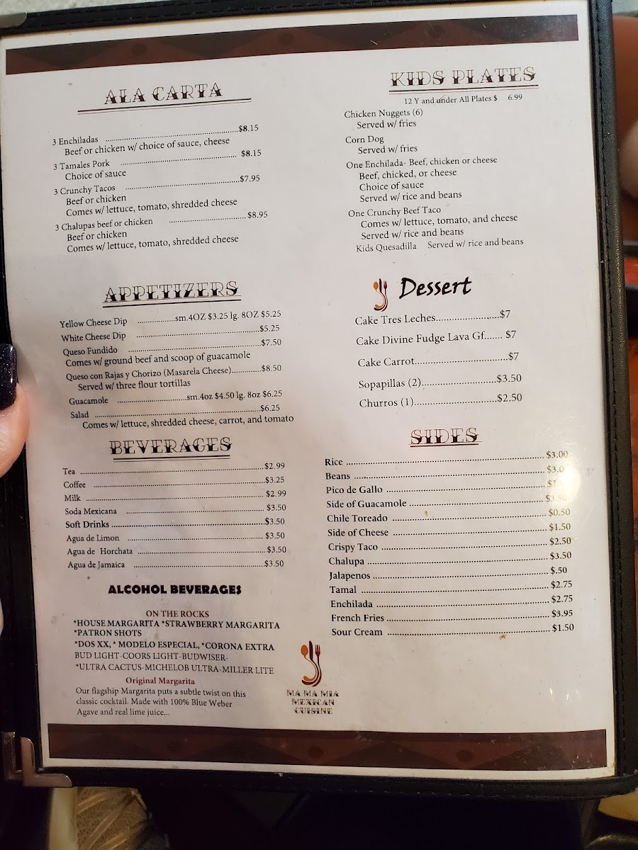 “ We absolutely love dining here. The food is delicious, with a great variety of drinks. I'm my opinion the salsa and the margaritas always make it break a Mexican restaurant, and Mama Mia's did not disappoint on either. I do wish that their patio was a bit further back from the main road and had better tables/chairs. The other wish I have is for better parking. Depending on the time of day, you may have to wait to be seated, but it's totally worth the wait. They also have great take-out service. ”